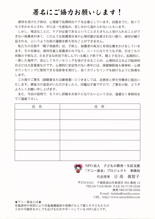 子ども達には18歳を過ぎてからお世話になる所として、また、実親には、児童相談所を卒園しても親子相談所との長い付き合いがあると思っていただきたいのです。